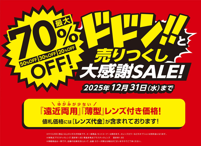 税込13,200円以上のメガネを対象に最大70%OFFになる